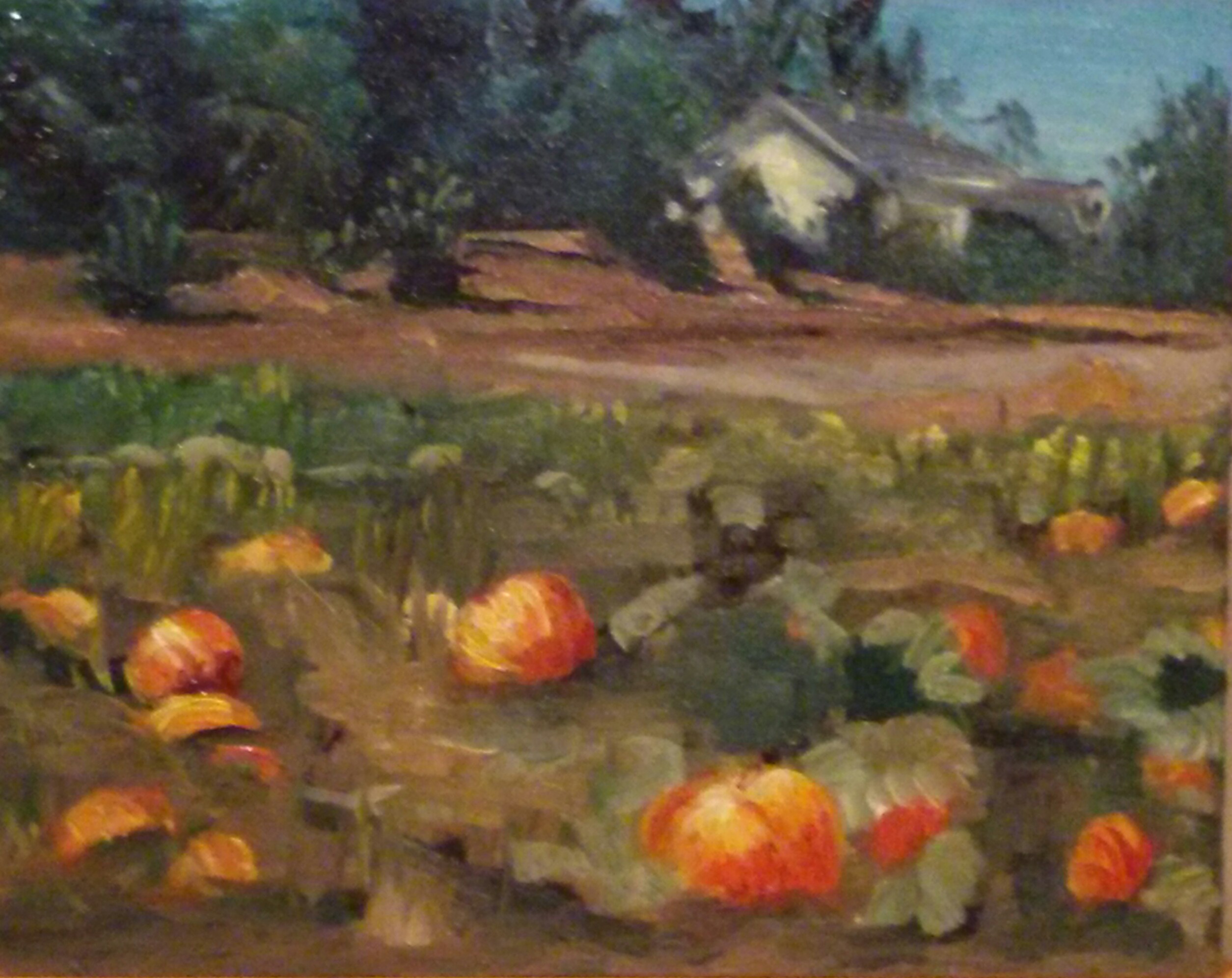 One of my favorite things are pumpkin patches and the first showings of Autumn coming. I was driving from my office to another and spotted the orange. I am trying to move more towards the painting style that I most love, Impressionism, This little painting is edging toward it.