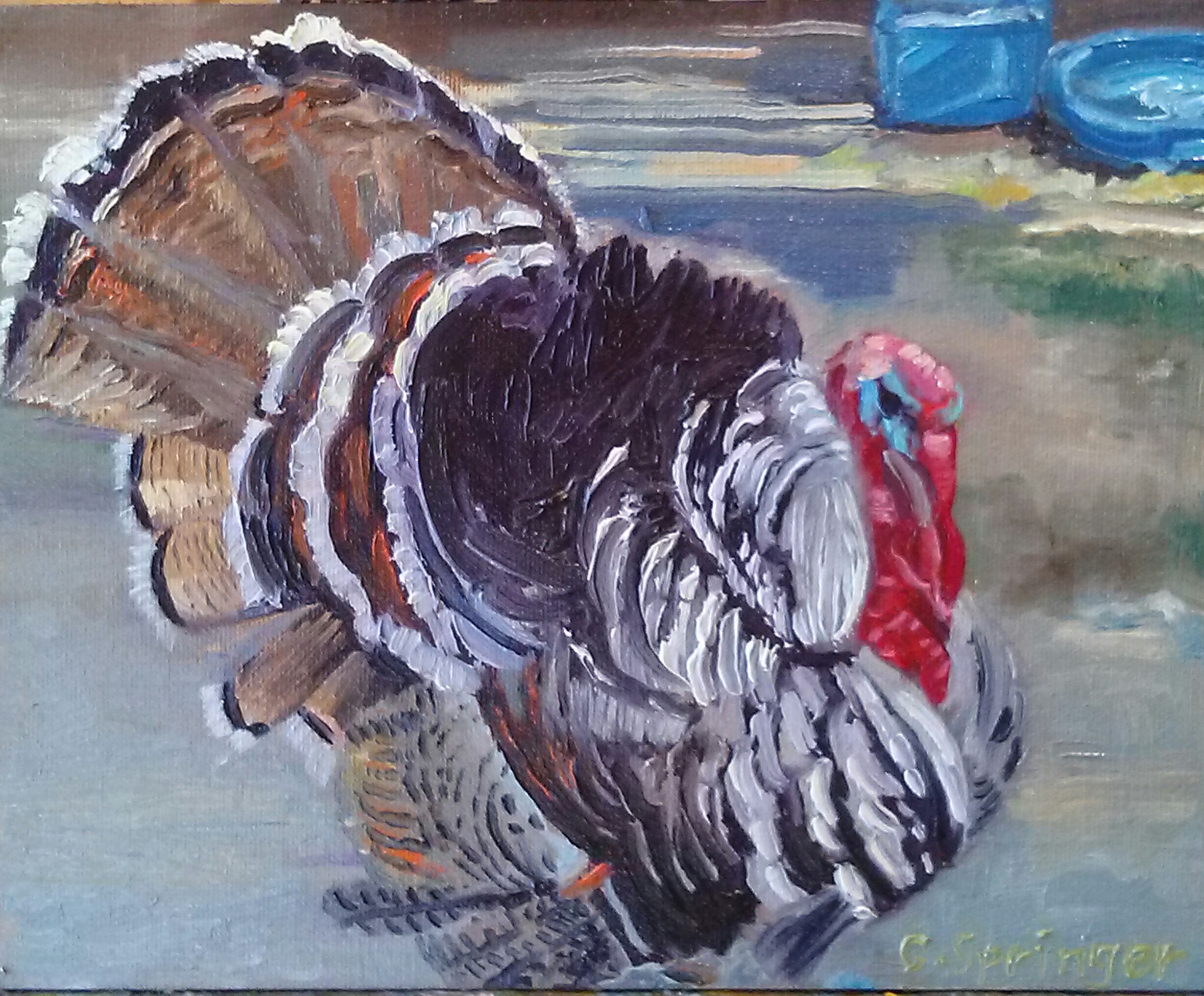 Some people and some animals have a super special quality and uniqueness about them and I would say this describes ‘George’. He is a Heritage turkey belonging to my friend, Cyndi. I first met George a few weeks ago and he followed us around strutting his stuff. he was so friendly and sweet that I wanted to take him home with me. But I couldn’t so I will paint him instead and think good thoughts every time I look at his image. God makes such beautiful things.
