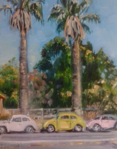 Today is the start of “30 paintings in 30 days” from Leslie Saeta’s Blog. My theme this time is “Transportation, past and present”. This topic has so many great possibilities. For today’s painting my inspiration came from a photo I took when driving home from Patris’s Studio in Sacramento after taking a workshop with Randy Blasquez. As I was driving I saw these 3 VW Bugs lined up with the palms and pulled over and took the photo.